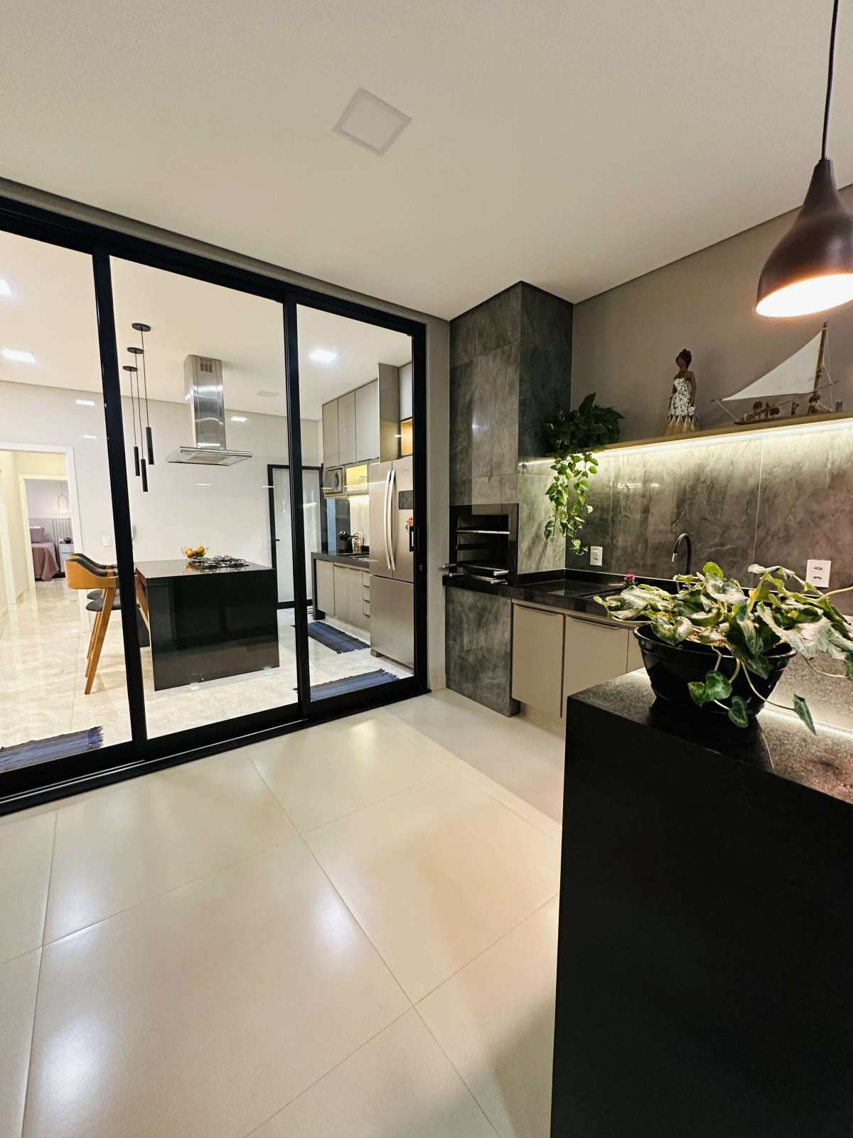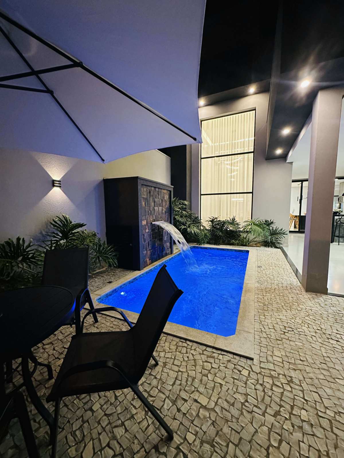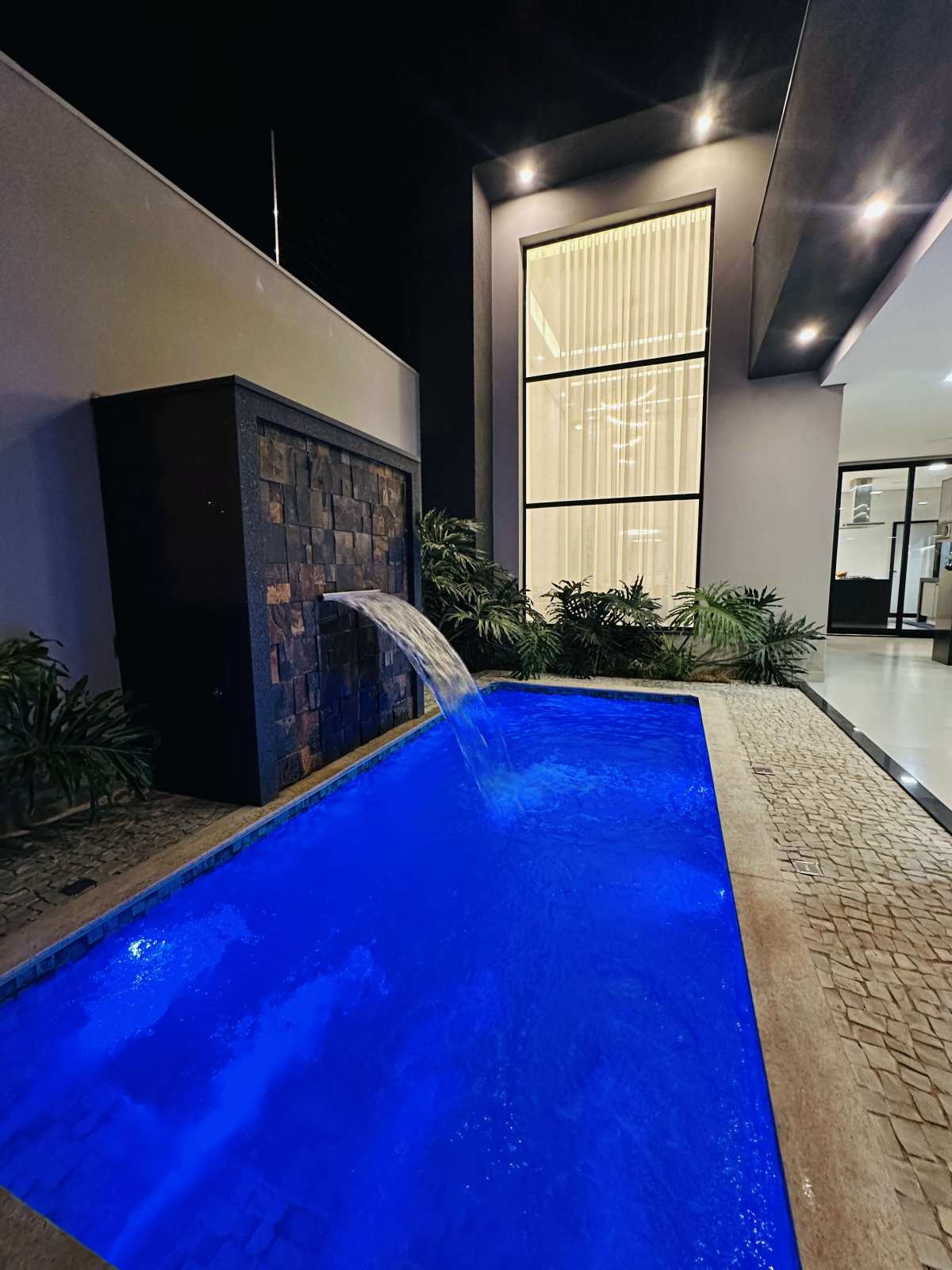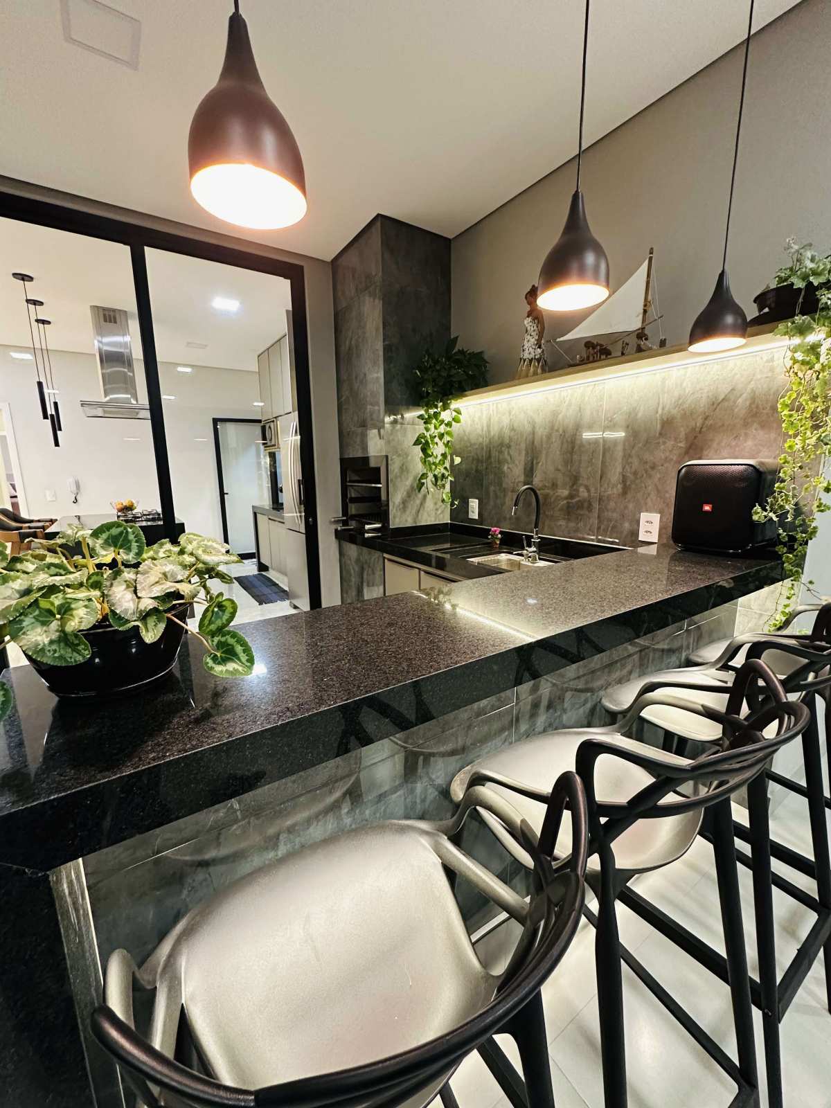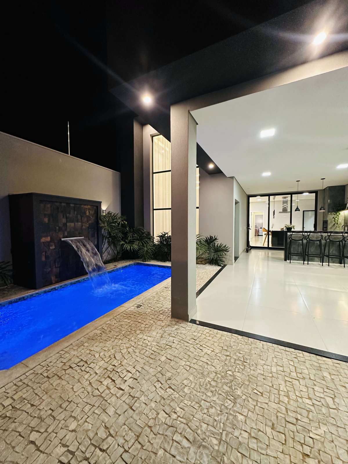 Área gourmet com churrasqueira, e piscina aquecida com hidromassagem e cascata.