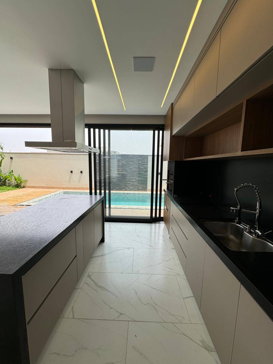 Cozinha equipada com coifa, armários modernos e churrasqueira integrada