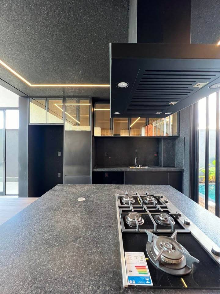 Cozinha planejada com marcenaria requintada, mesa embutida, coifa e cooktop