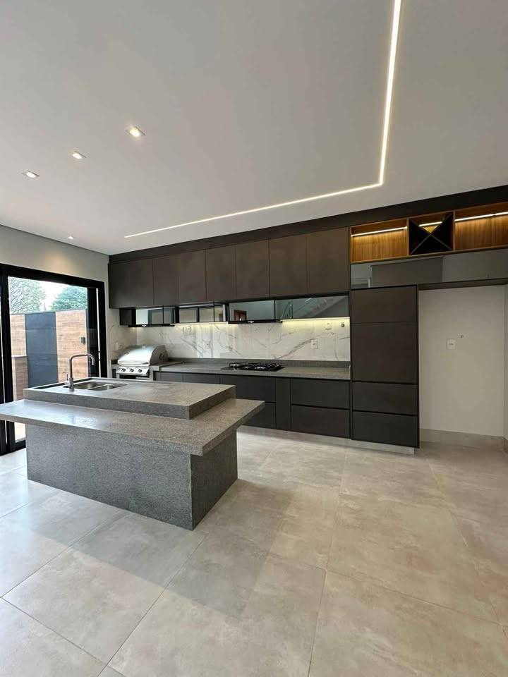 Cozinha gourmet completa, com ilha, cooktop e churrasqueira a gás